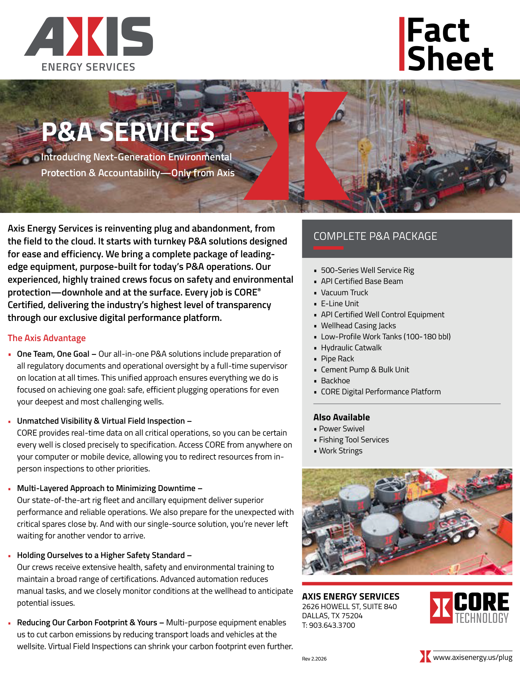 Axis Energy Services is the leading provider of plug and abandonment solutions in the U.S. land market. We bring fully wrapped P&A packages featuring leading-edge equipment and highly experienced crews with the expertise to solve your downhole challenges. This combination is how Axis delivers industry-leading safety and efficiency, even on your deepest and most complex wells. Optional Axis CORE® technology provides real-time online access to all critical job data, potentially saving you trips to the wellsite.
